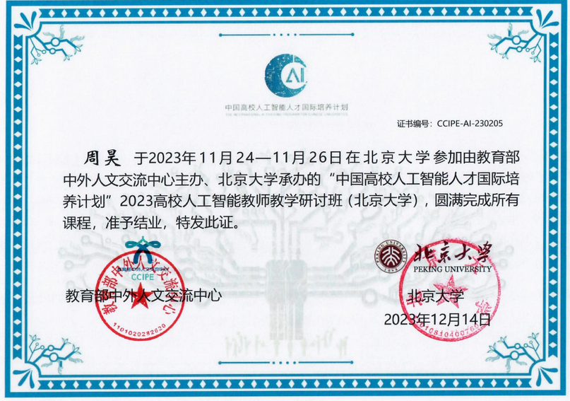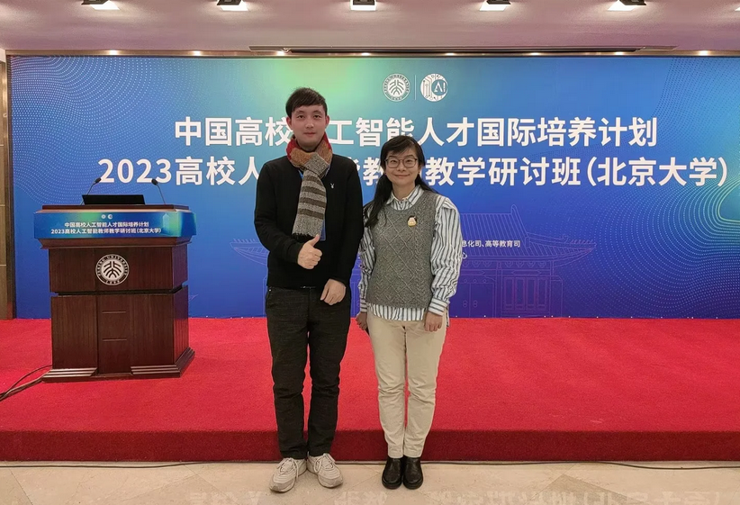 发表时间:2023-11-25 11:13 2023年11月24日-26日,由教育部中外人文交流中心主办、北京大学承办、腾讯开悟协办的“中国高校人工智能人才国际培养计划——高校人工智能教师教学研讨班”在北京大学开班,周昊老师参加了学习。 本次研讨班由一批来自北京大学的国际顶尖科学家进行授课,如北京大学计算机系主任李文新老师、全球AI华人女性青年学者仉尚航老师、北京大学王选计算所青年科学家IEEE Fellow 刘家瑛老师、台湾大学IEEE Fellow郑文皇老师等,他们从人工智能、机器学习、自然语言处理、计算机视觉等各课程的课程设计及教学方法进行分享。 周昊老师表示收获巨大,并结识了同样做图像复原的青年科学家刘家瑛老师。同时也参观了清华大学。